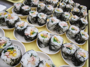 今日の給食は、恵方巻とイワシのかば焼き、根菜汁、りんごとバナナです。咀嚼力がまだ育つ過程のお子さんもいるので、きざみ海苔で巻きました。いつもとは違うメニューに喜んでいました。