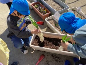 水耕栽培のヒヤシンス、年長児がグループごとに育てていました。見事に花を咲かせたので、土に植えて球根を太らせます。日の当たる場所、栄養をどう与えるか等みんなで考えながら、場所を決めていました。