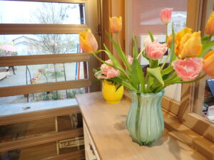 令和8年度がスタートしました。園庭の木々も芽吹きはじめ、枝垂桜も満開です。玄関も室内もたくさんの花で、入園と進級をお祝いしています。