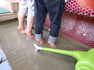 チューリップがたくさん咲いてお花に水やりが盛んになってきました。水道では様々な大きさのジョーロにどうやって水をためるか、2歳児が試しています。いつのまにか水との遊びに夢中になっていました。