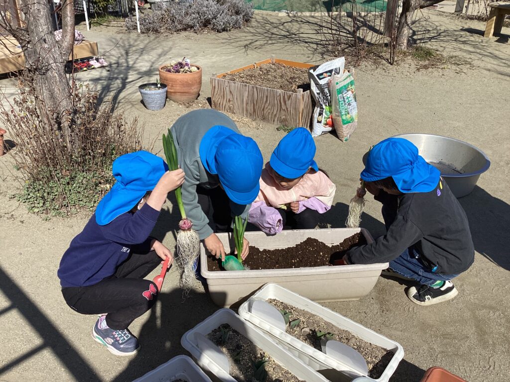ヒヤシンスまた来年咲いてね 2026年3月21日 最終更新日時 : 2026年3月21日 sunlight 水耕栽培のヒヤシンス、年長児がグループごとに育てていました。見事に花を咲かせたので、土に植えて球根を太らせます。日の当たる場所、栄養をどう与えるか等みんなで考えながら、場所を決めていました。
